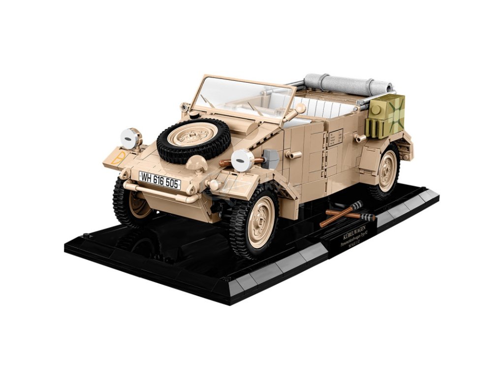 Kübelwagen v měřítku 1:12 uvádíme na trh ve spolupráci s Panzermuseum Munster. VW Kübelwagen byl široce používán německými ozbrojenými silami během 2. světové války. Dnes je Kübelwagen typ 82 často vnímán jako památník nebo exponát v automobilových muzeích po celém světě a slouží jako připomínka 2. světové války. Náš obrovský model se skládá z více než 1 500 kostek a obsahuje nové prvky, jako je čelní sklo, otevírací dveře, funkční volant, otočná kola, skládací střechu, roli látky, přístup k motoru a úžasný interiér. Tento vůz plný detailů byl vytvořen podle muzejního exponátu. Verze Executive Edition obsahuje stojan na vystavení modelu se jmenovkou. Sada obsahuje i doplňkové příslušenství jako je alternativní verze světlometů, granáty a kanystry.
