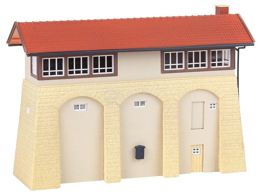 Úzká budova návěstidla se třemi svisle zděnými portály s kruhovým obloukem a sedlovou střechou. V horním patře je umístěna řídicí místnost s okny.