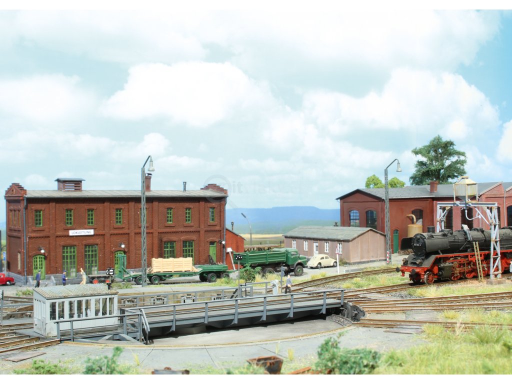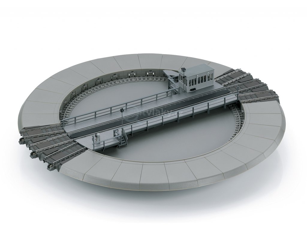 This is a DB standard design 23 meter / 74 foot 9 inch turntable. It is designed for conventional and digital locomotive operation. The remote controlled deck has a built-in motor. It can only be controlled digitally with the Mobile Station 2 and Central-Station 2 and 3 (not included). Control with the Central-Station 2 and 3 is especially easy by means of track indexing (after carrying out an update), or with different digital central controllers that use the DCC digital format. Function: The deck turns right/left and the pit is designed for sunken installation in the layout. 6 track spoke connections for C Track are included for insertion at the location of your choice. The spoke angles are in the C Track grid spacing of 12°. A maximum of 30 track spoke connections in the spacing of 12° can be done with the 66871 expansion set. Locomotive operating current is supplied to the track spoke connections by means of the turntable deck. Polarity change can be programmed. The external diameter of the turntable with one each spoke track opposite each other is 378 mm / 15-1/32". The diameter of the pit without spoke tracks is 278 mm / 10-15/16". The deck length is 263 mm / 10-3/8". This turntable can be used with the 72886 roundhouse locomotive shed. Various sound functions can be controlled. LEDs are used to light the turntable operator's hut and the outside lighting and they can be controlled.