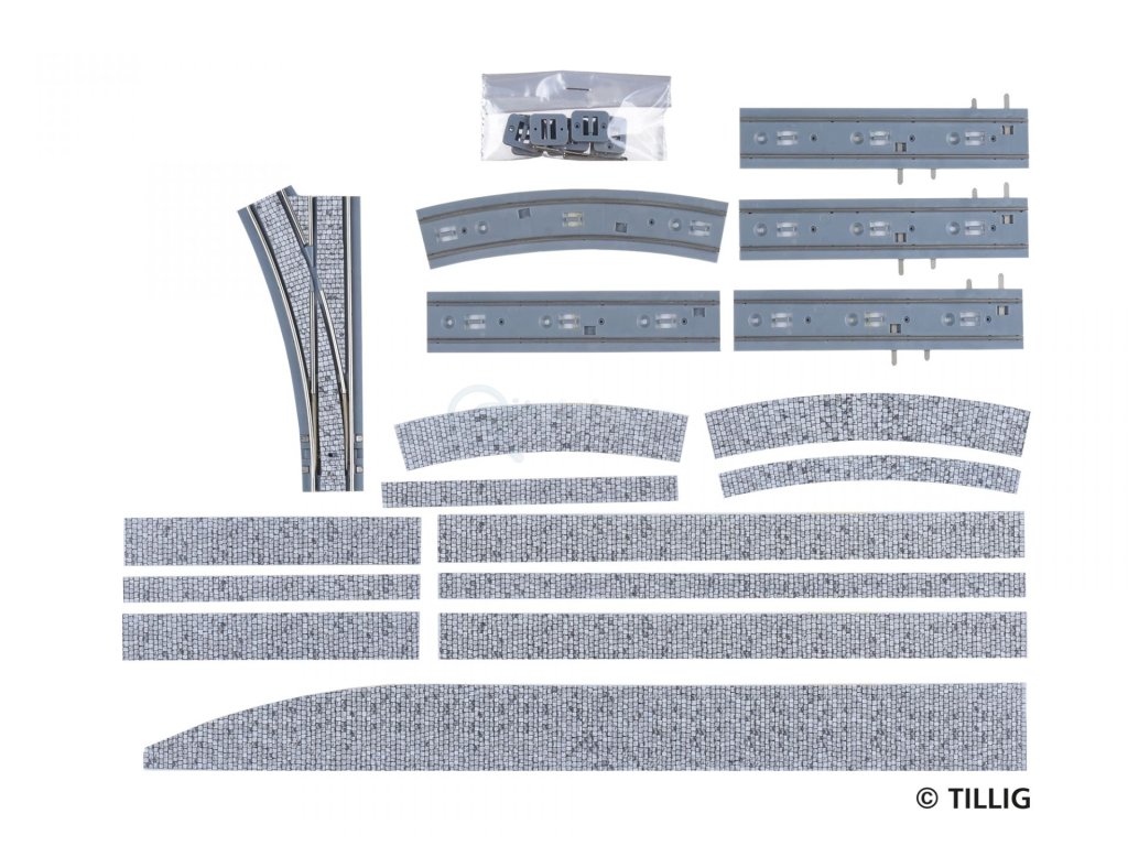 H0m/TT - Kolej a výhybka levá s dlažebními kostkami / Tillig 87111