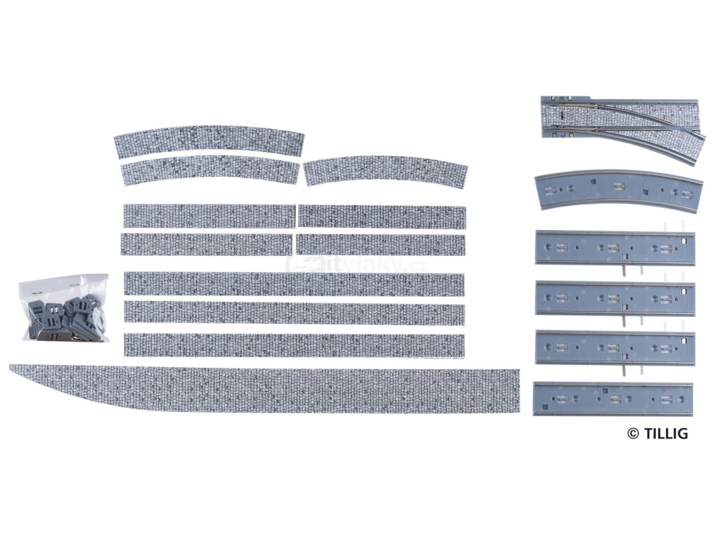 H0 - Kolej a výhybka pravá s dlažebními kostkami / Tillig 87616