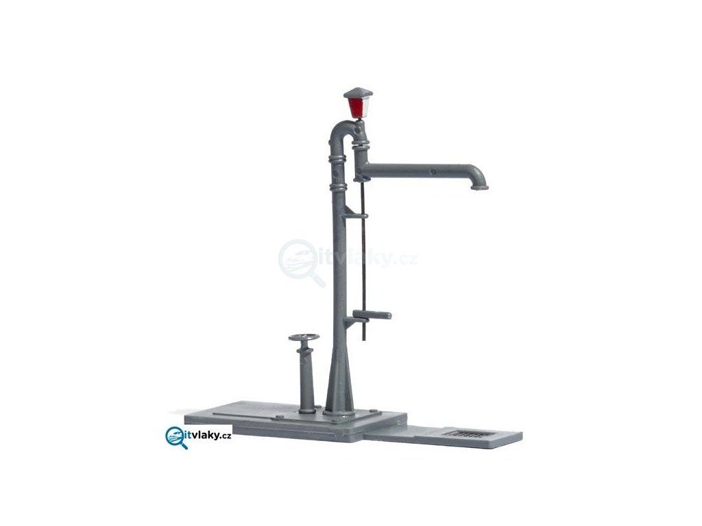 Vodní jeřáb standardního rozchodu saské konstrukce pro plnění parních lokomotiv na nádražích a v depech. Otočná konstrukce s kloubem a kovovou tyčí. Signální lampa (nesvítící) na horním konci. Včetně základové desky, odkapávací vpusti a mřížky.