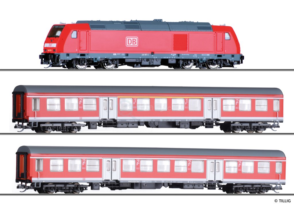 Startovací sada: Osobní vlak DB AG, sestávající z dieselové lokomotivy „TRAXX“ a dvou osobních vozů typu Halberstadt, Era V Model v měřítku TT.