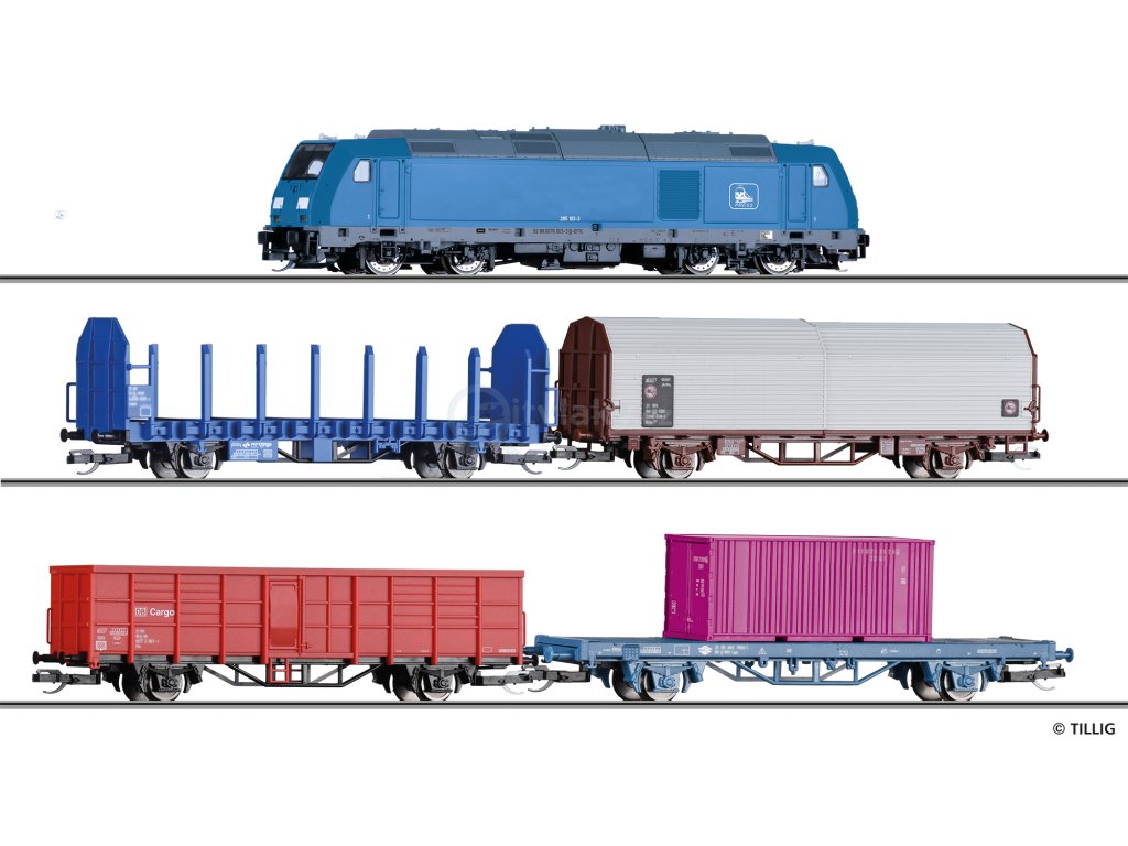 Startovací sada: Mezinárodní nákladní vlak, sestávající z dieselové lokomotivy „TRAXX“, táhlového vozu Laps, plachtového vozu Kils, otevřeného nákladního vozu Fbs a kontejnerového vozu Lgs, éra VI Model v měřítku TT.