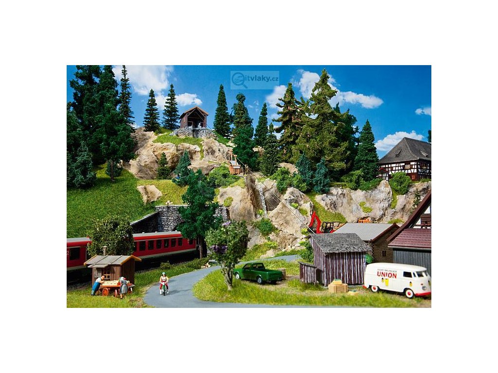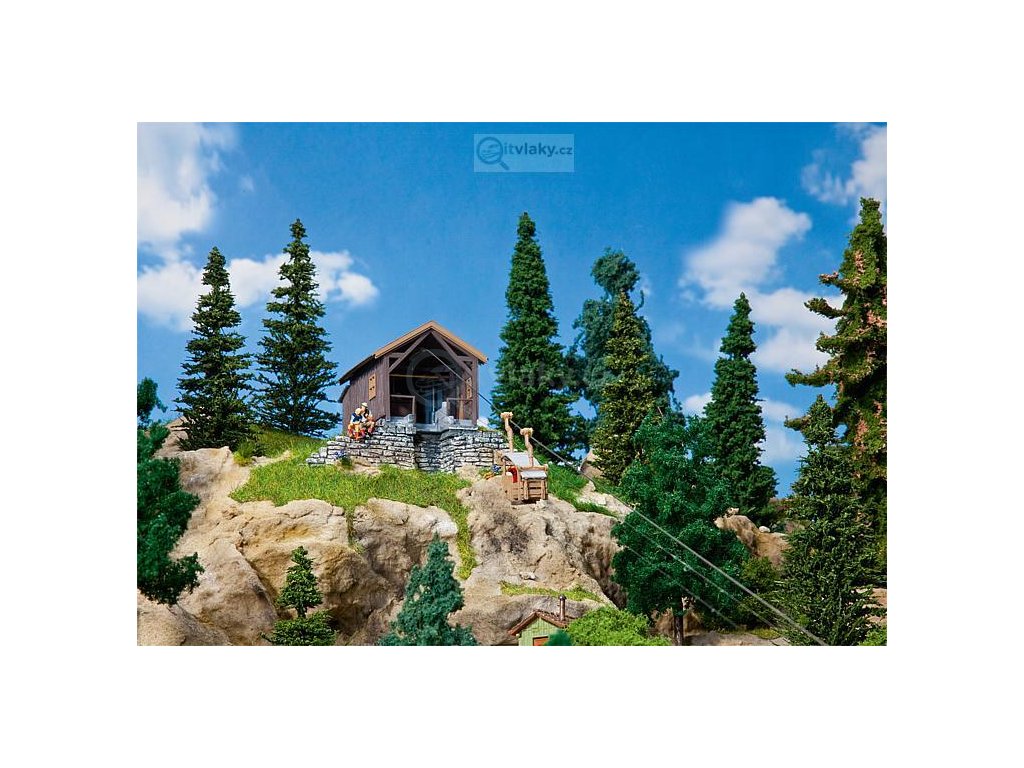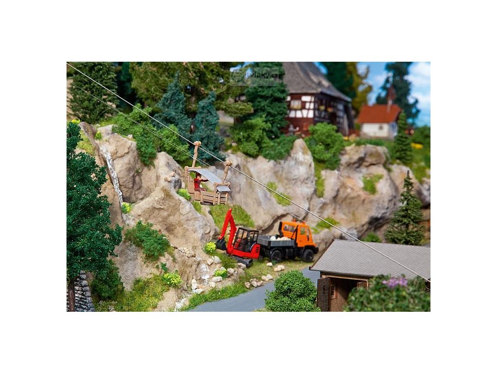 Alpské krmítko! Jednokolejná malá lanová dráha se dvěma různými dopravními gondolami pro nejrůznější využití v nepřístupných horských oblastech. Zatímco zboží se přepravuje v otevřené dřevěné skříni (k příslušenství patří i konve na mléko), krytý nákladní vůz je vhodný i pro přepravu osoby. Lanovka na materiál slouží k přístupu na horské farmy nebo slouží jako karimatka pro vyznavače horských sportů ve vysokých nadmořských výškách. Horská a údolní stanice v otevřené konstrukci jsou obloženy dřevem a jejich střešní části jsou věkovité. Pohonný motor je umístěn v horské chatě se šindelovou střechou, zadním přístavkem, odpočinkovou lavicí, kamny na dřevo a krbem. Pohonný motor a řídicí jednotka jsou součástí stavebnice.