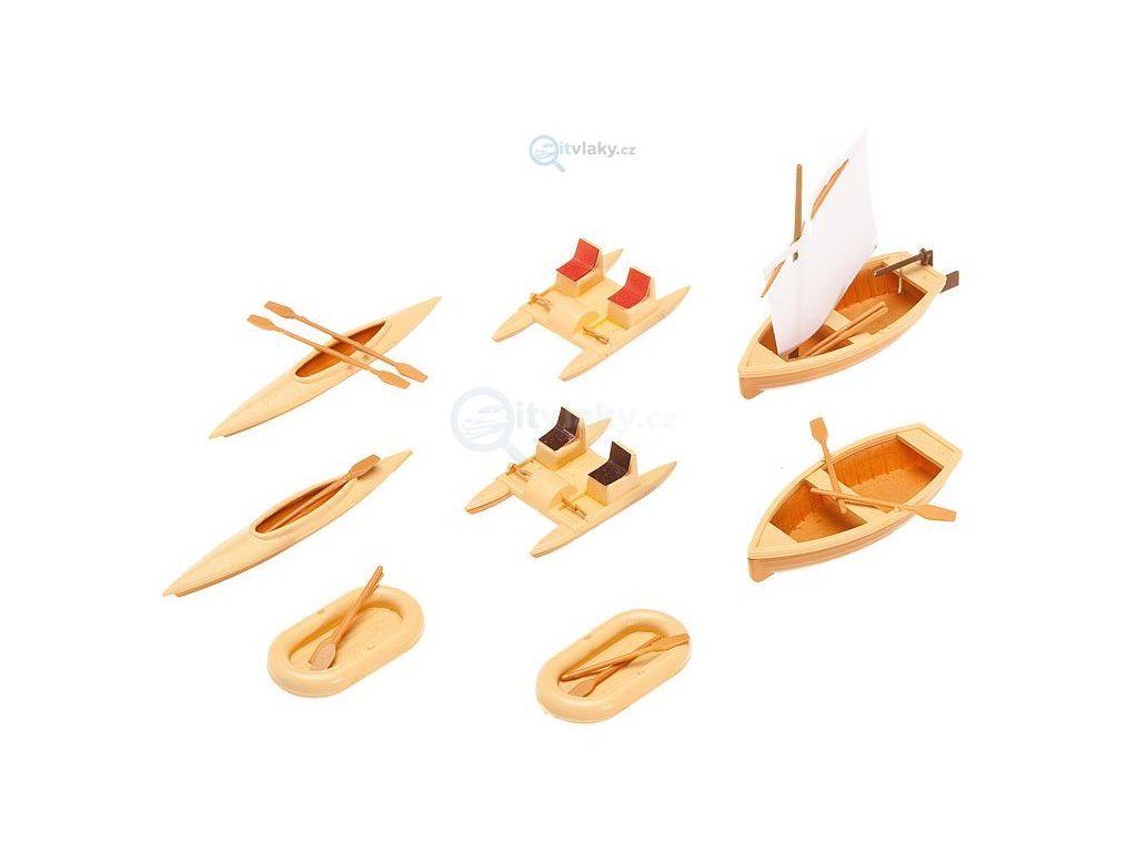Tato sada obsahuje 1 veslici, 1 plachetnici, 2 nafukovací čluny, 2 šlapadla a 2 kánoe k vytvoření plážových a vodních scén.