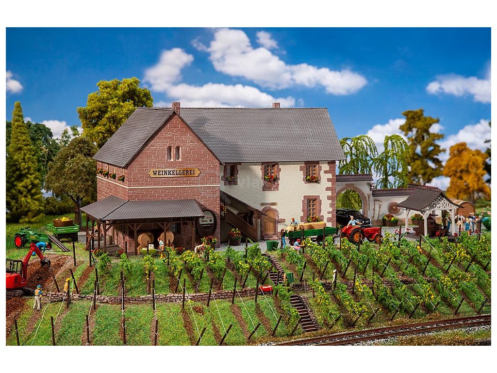 Požitek z vína! Patinovaný model vinařství sestávající ze dvou dvoupodlažních budov propojených do tvaru písmene L s vnějším schodištěm a zastřešeným venkovním prostorem. Nárožní kameny, okenní a dveřní šambrány omítnuté poloviny budovy jsou obloženy kamenem. Součástí konstrukčních prvků jsou sudy na víno, kádě a kádě na květiny.