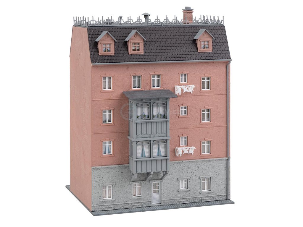 Čtyřpodlažní městský dům se štukovou fasádou, dvoupatrovým arkýřem v zadní části budovy, vikýři a střešními ploty. V přízemí se nachází advokátní kancelář. Jednotlivá okna modelu lze zobrazit otevřená.
