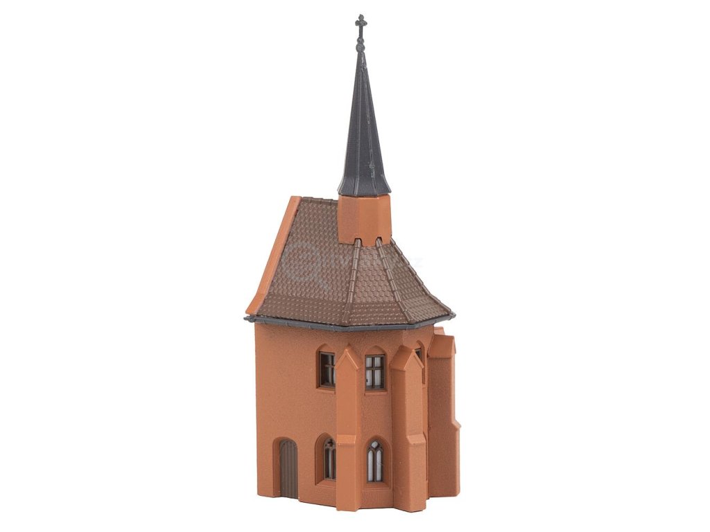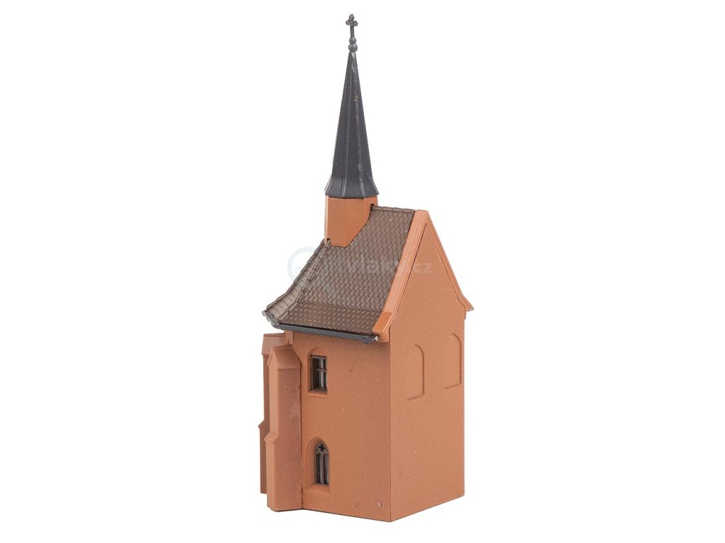 Malý kostelík s polygonálním průčelím, výraznými pilíři, špičatou stanovou střechou a bočním vchodem.