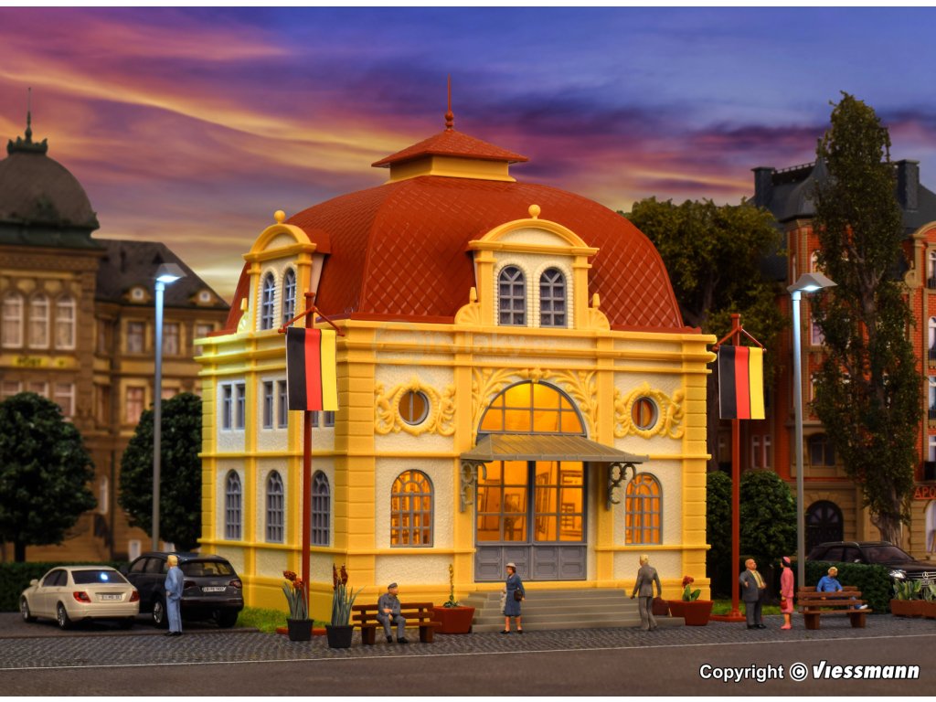Tato impozantní budova slouží jako sídlo velvyslanectví. Souprava je vybavena praktickým a variabilním podlahovým osvětlením interiéru od společnosti Viessmann. To nabízí neomezené možnosti individuálního osvětlení budov s velkými okenními průčelími. Rozměry: D 12,6 x Š 12,5 x V 16,7 cm.