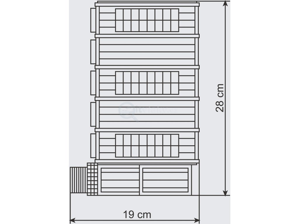 Tato budova s plochou střechou má 5 bran pro nakládku a vykládku kamionů. Délka 28 x šířka 19 x výška 15 cm.