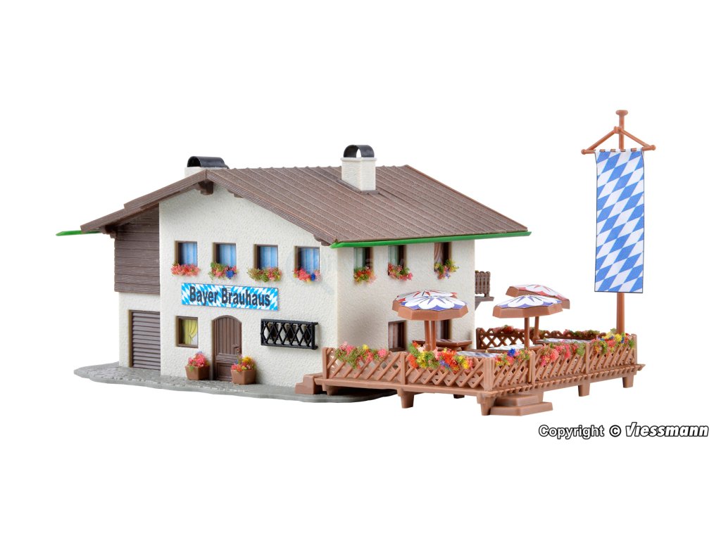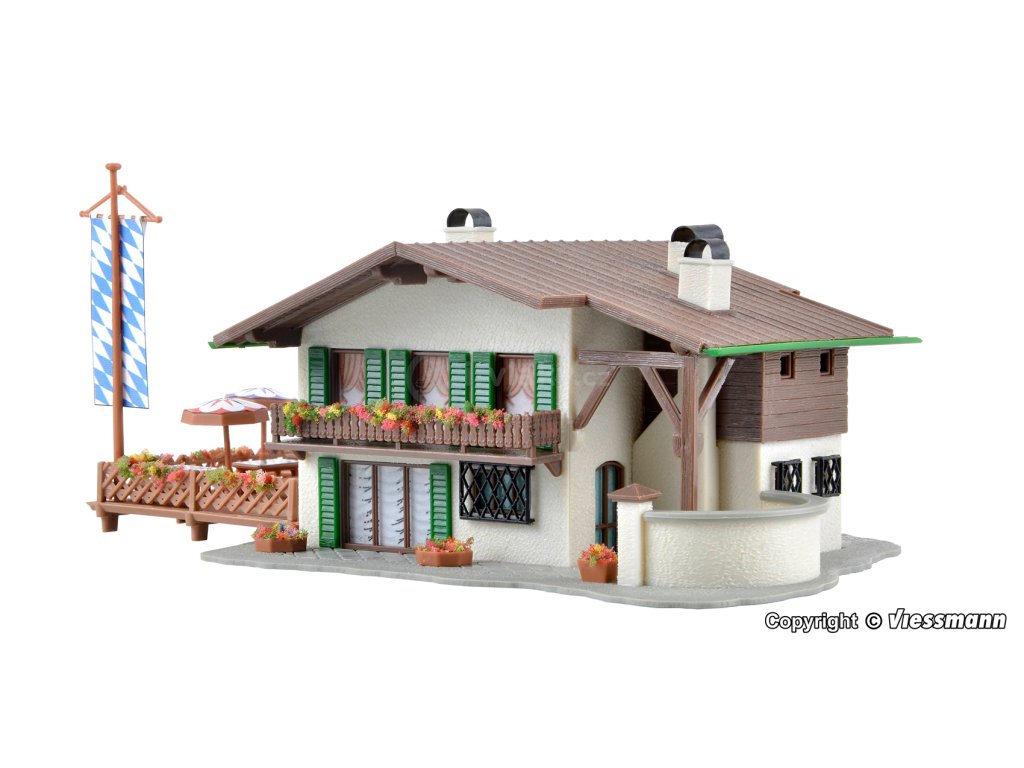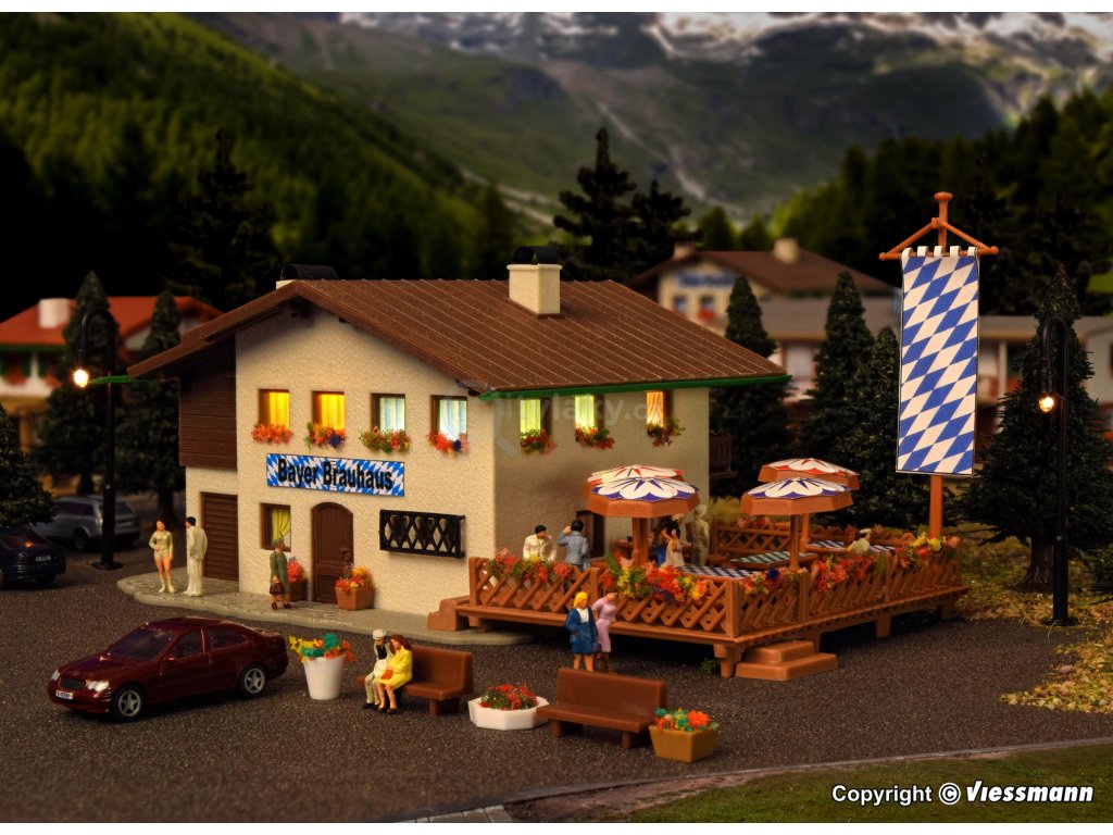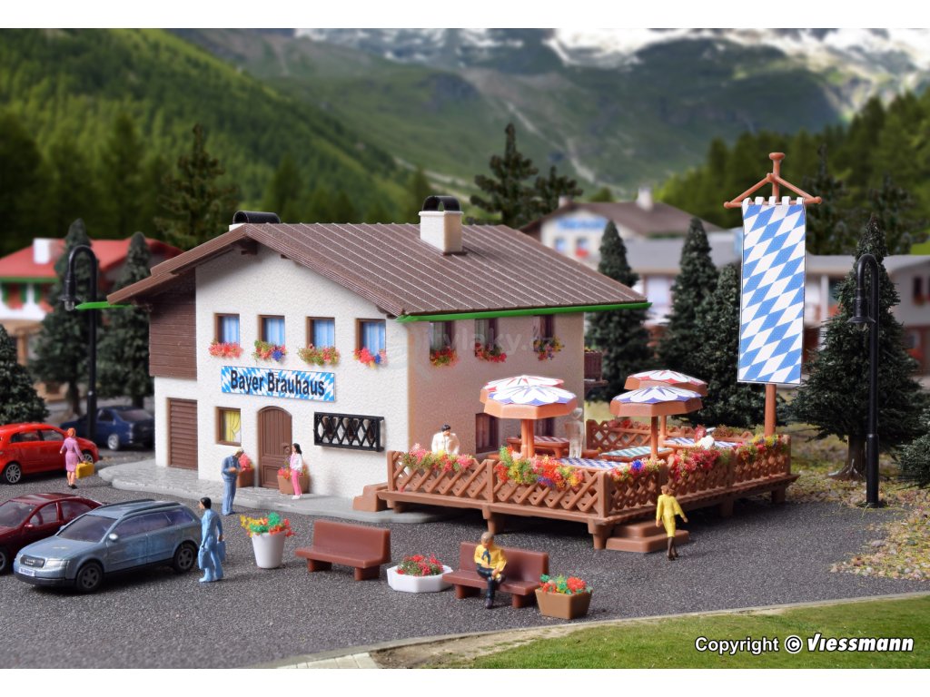 S venkovní terasou, stoly, lavicemi, slunečníky a vlajkou. Rozměry: D 10 x Š 8,5 x V 5,5 cm. Terasa: D 6 x Š 5,5 x V 6 cm.