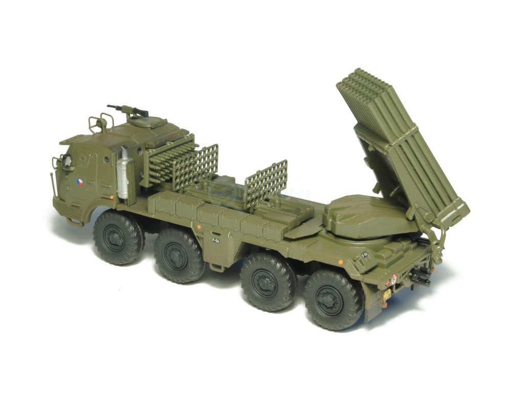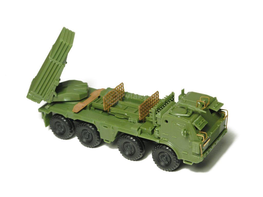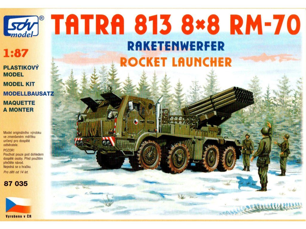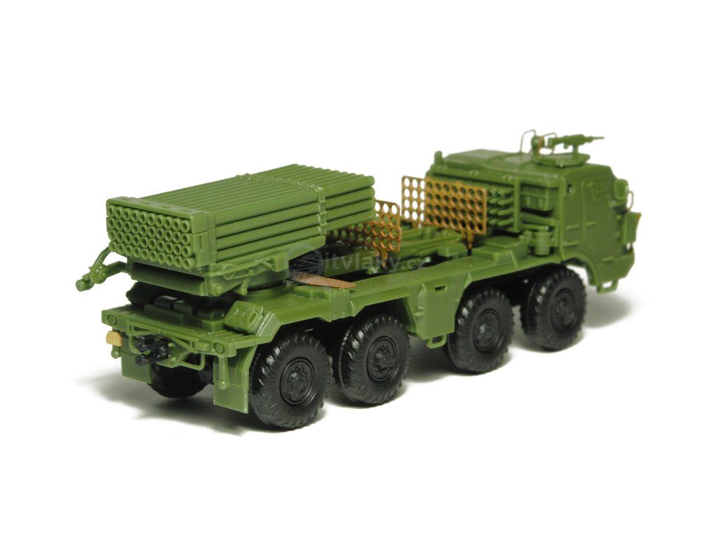 Kompletní plastiková stavebnice raketometu RM-70 Grad. Obsahuje probarvené plastikové výlisky, leptané doplňky, kovové osičky a sadu obtisků.