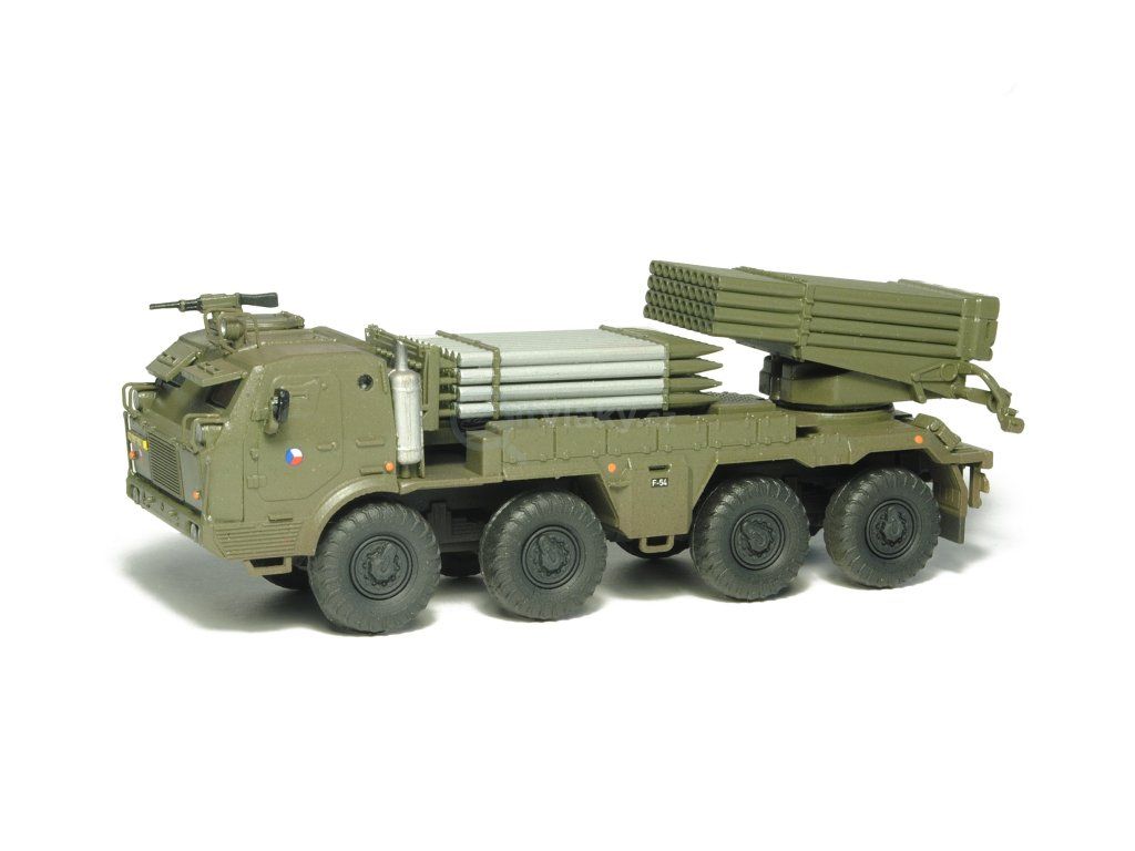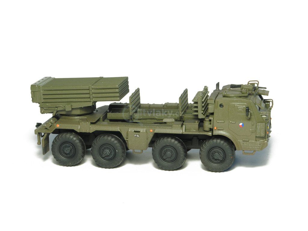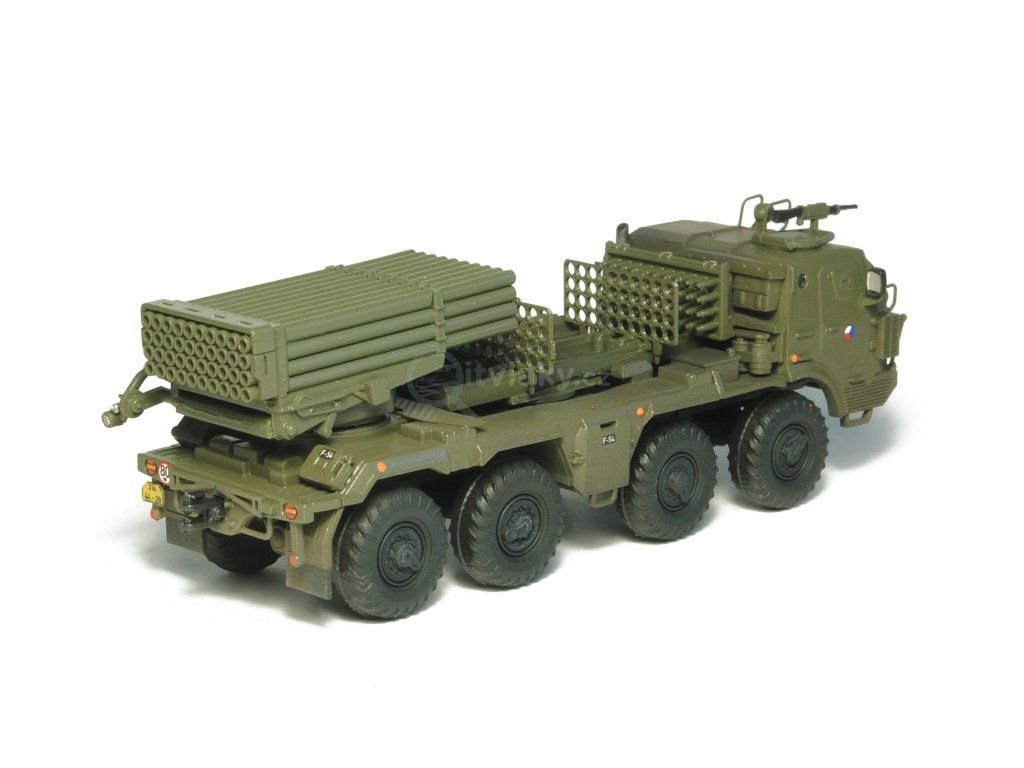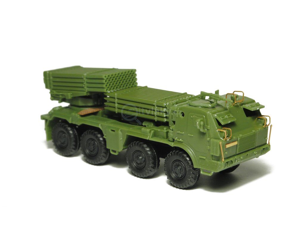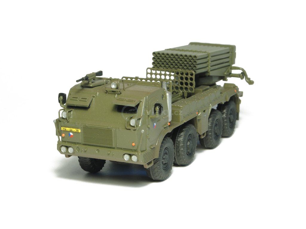 Kompletní plastiková stavebnice raketometu RM-70 Grad. Obsahuje probarvené plastikové výlisky, leptané doplňky, kovové osičky a sadu obtisků.