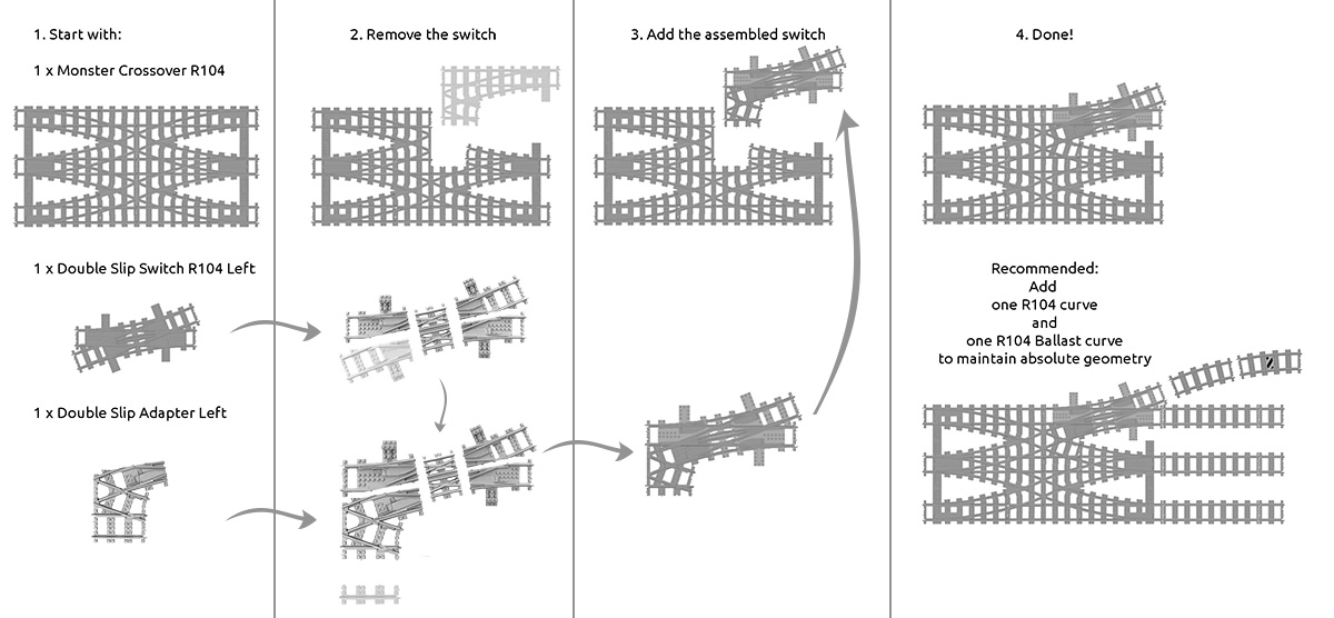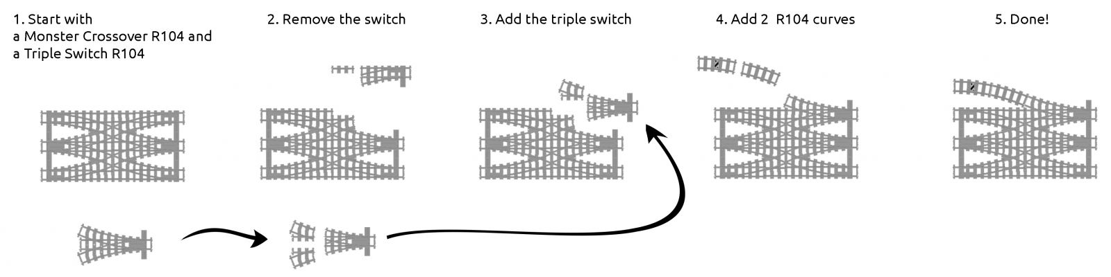 Díky modulárnímu systému lze monstrózní křižovatku rozšířit do stran na neomezené množství kolejí. K výhybce R104 je možné připojit také dvojité skluzové výhybky