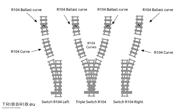 Plynulé sloučení nebo rozdělení tří kolejí do jedné. Vytvářejte důmyslné a náročné plány. Poloměr R104 umožňuje bezproblémové připojení dalších výhybek R104 od společnosti Trixbrix. Například; přidejte dvojitou skluzovou výhybku na jednu nebo obě strany trojité výhybky.