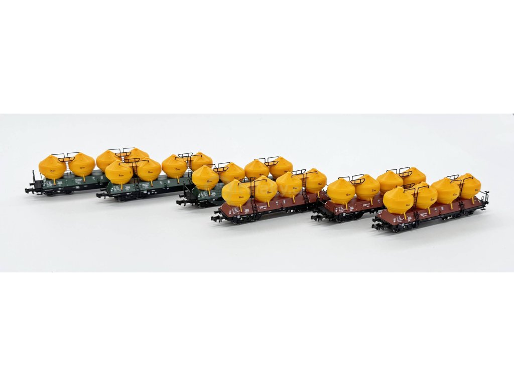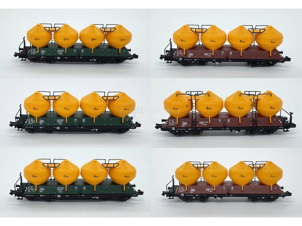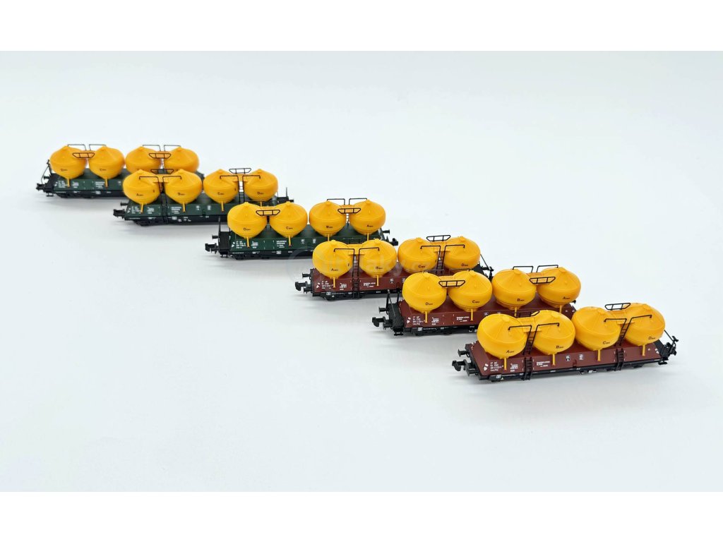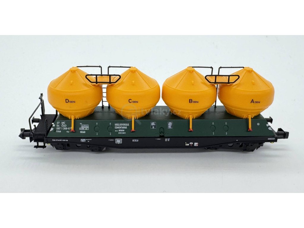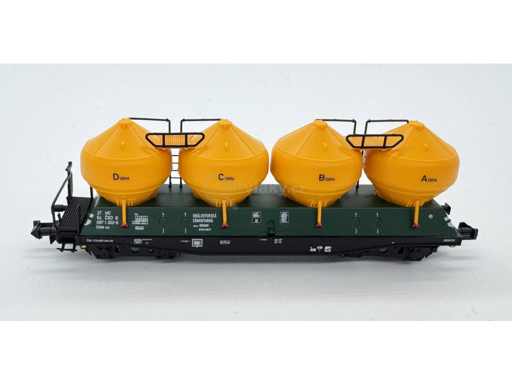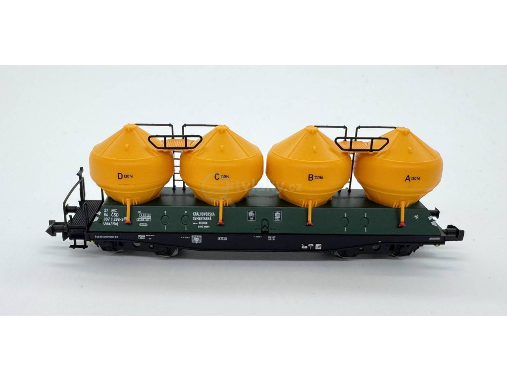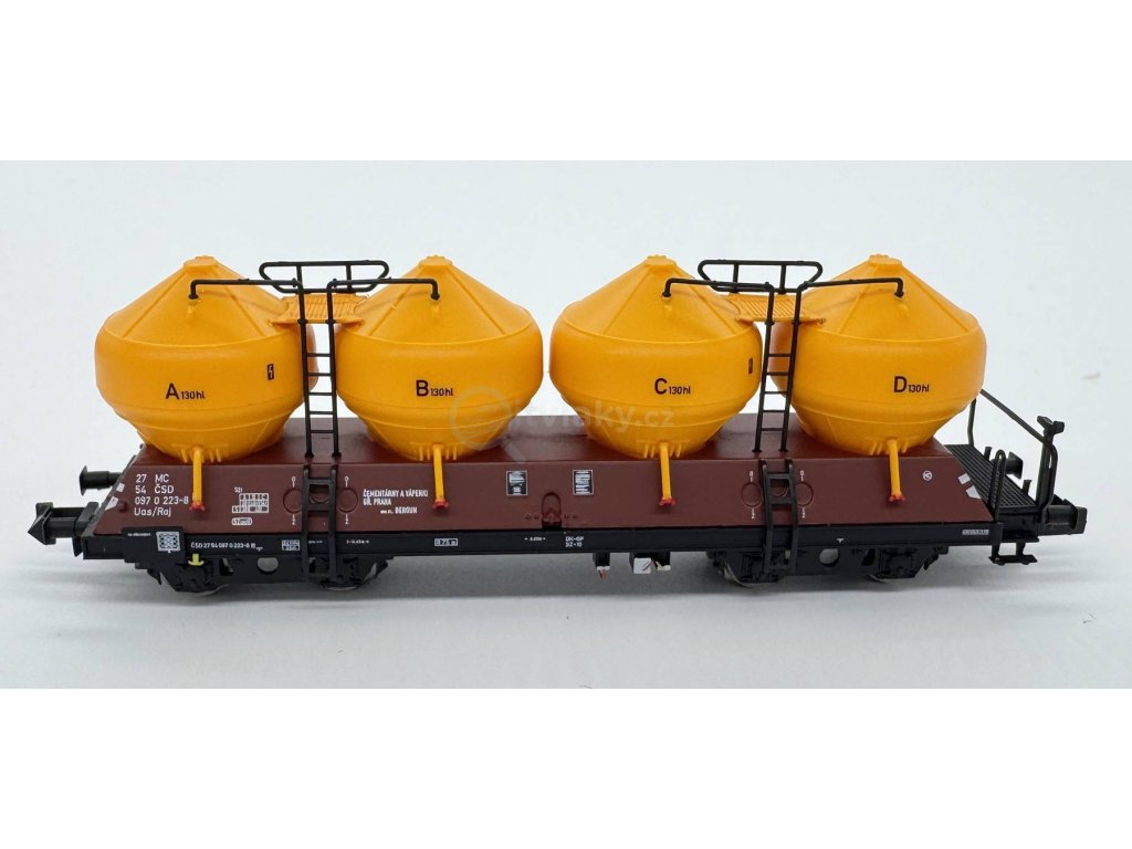 Vorbild: 6 vierachsige Silowagen der Bauart Uacs der der Bahngesellschaft Československé Státní Dráhy (ČSD). 3 Silowagen in der Ausführung mit geradem Langträger (rotbrauner Kastenaufbau) und 3 Silowagen in der Ausführung mit "Schürze" (moosgrüner Kastenaufbau). Alle 6 Wagen mit melonengelben Behältern. Betriebszustand um 1974.