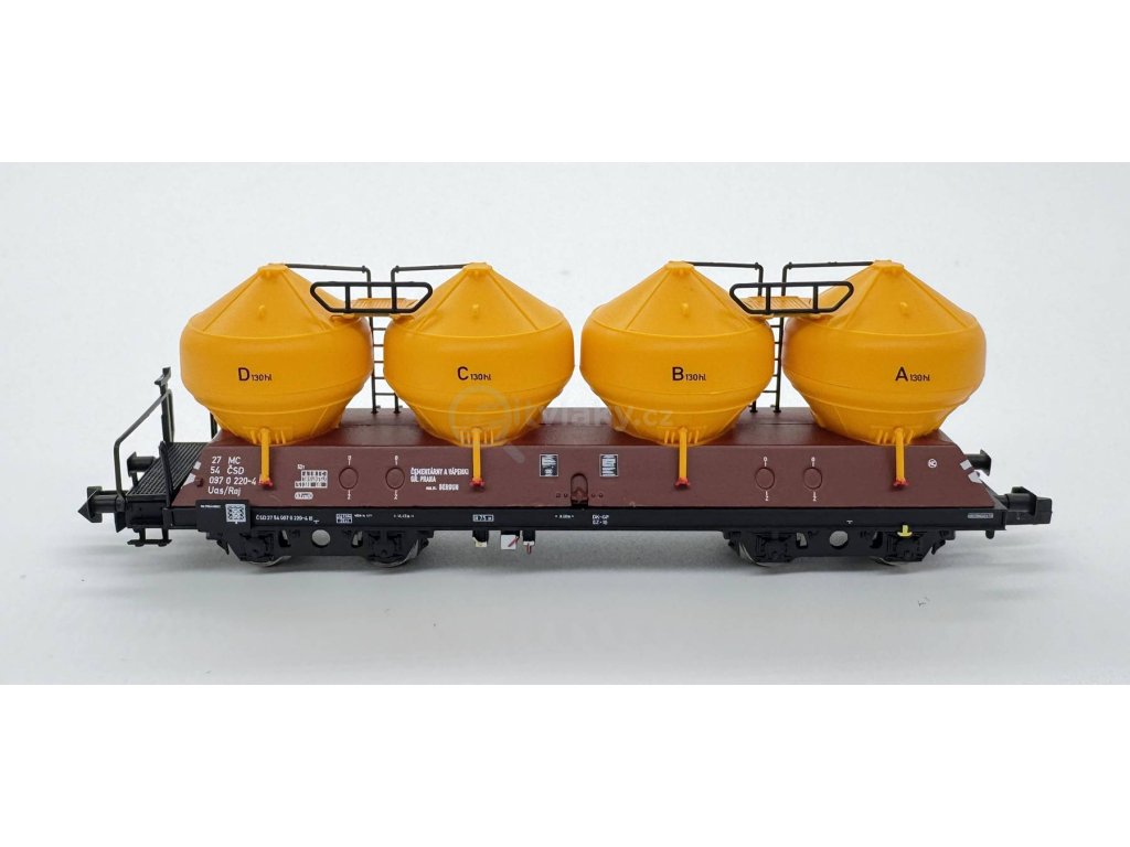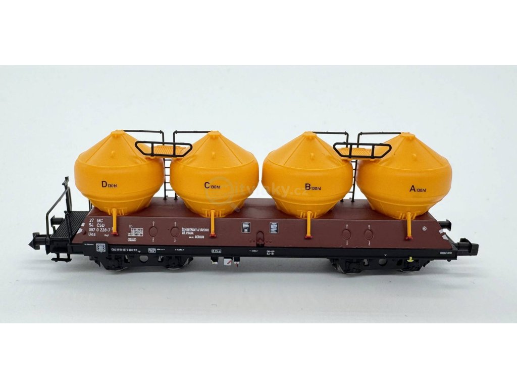 Prototyp: 3 čtyřnápravové silážní vozy typu Uacs železniční společnosti Československé státní dráhy (ČSD). 3 silážní vozy v provedení s rovným podélným nosníkem (červenohnědá skříňová karoserie) a 3 silážní vozy v provedení s "obrubou" (mechově zelená skříňová karoserie). Všechny 3 vozy mají kontejnery melounově žluté barvy. Stav kolem roku 1974.