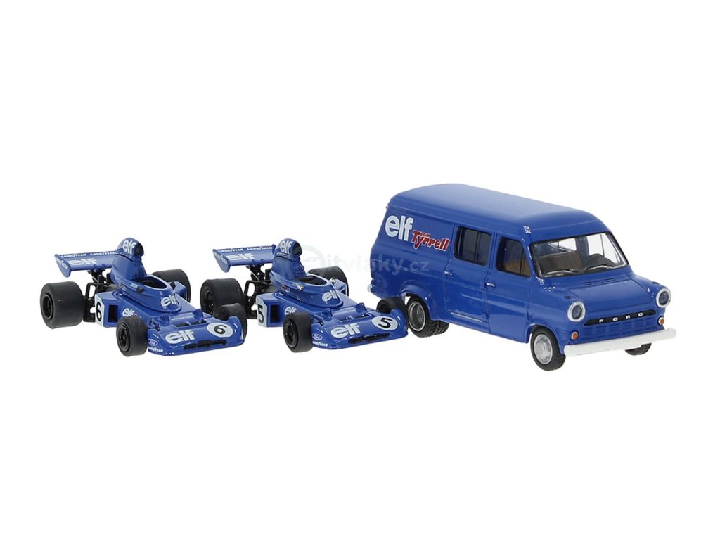 H0 - Sada 'Tyrrell 006' z roku 1973 se 2 formulemi a Fordem Transitem / Brekina 22871
