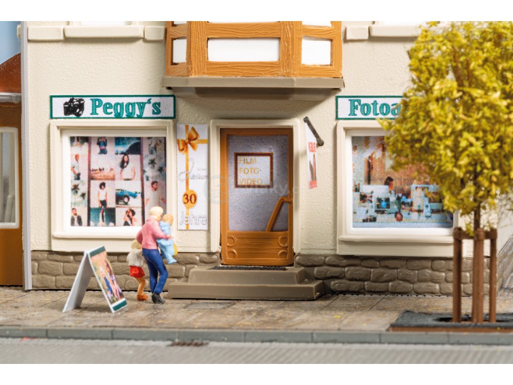 Typická obytná budova s obchody v přízemí, která se okamžitě hodí do centra města. Součástí jsou dekorace buď pro obchod s hodinkami a klenotnictvím, nebo pro fotoateliér, takže si ji snadno přizpůsobíte své vlastní pouliční scenérii.