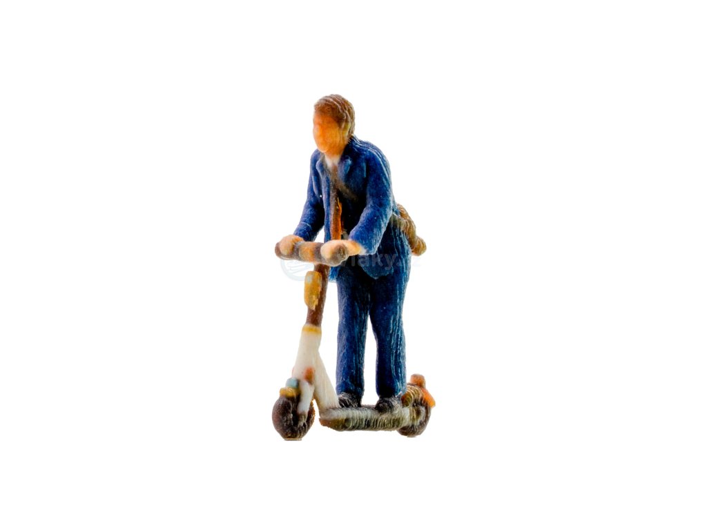 Doplňkový prvek vhodný pro kolejiště a dioramata. „H0 – Muž na e-koloběžce / NOCH 10607“.