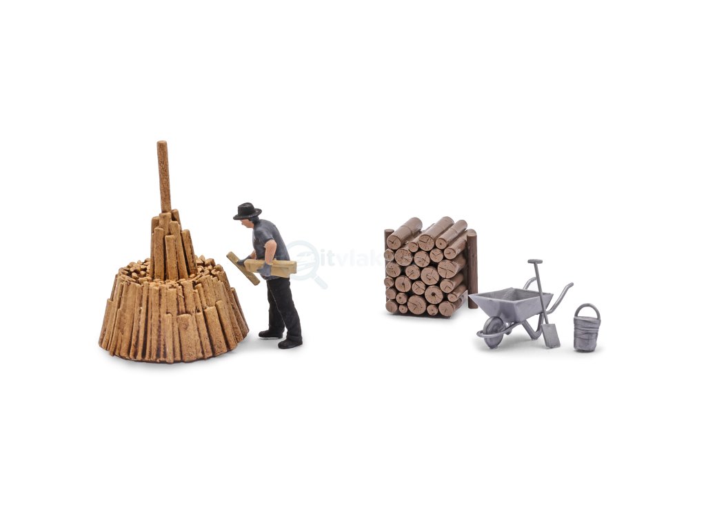 Akční sada pro realistické oživení modelové krajiny, ideální do lesa, na mýtinu nebo k okraji vesnice. Set zachycuje uhlíře při práci, kdy pečlivě formuje kužel z dřeva pro milíř. Přesně ten typ činnosti, který dodá scéně příběh a smysl.