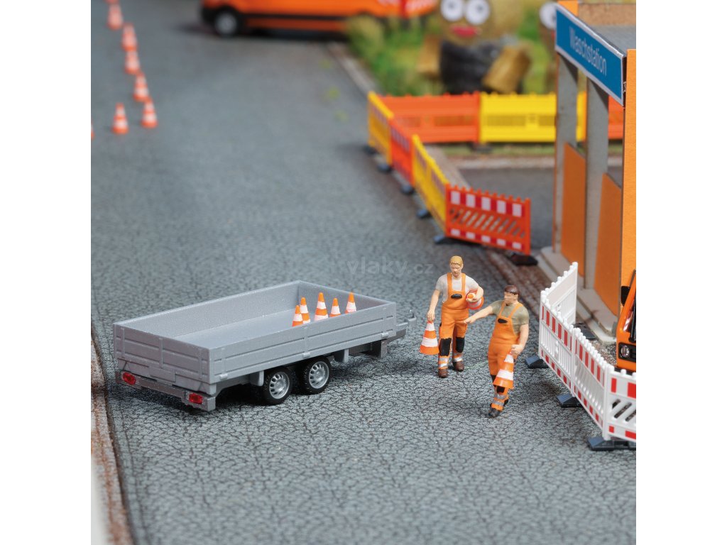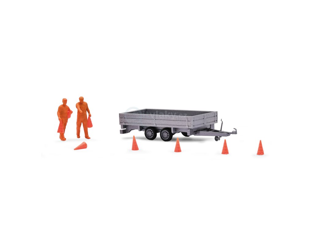 Součástí stavebnice je tandemový přívěs, 2 figurky pracovníků (určené k vlastnímu nabarvení) a 8 dopravních kuželů.