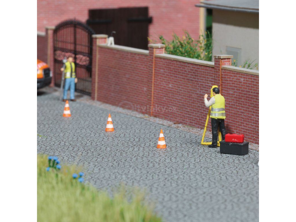 Akční sada pro realistické oživení moderních stavebních scén, zachycující práci geodetů při digitálním měření před zahájením další stavby. Dva pracovníci z geodetického úřadu provádějí přesná měření. Jeden obsluhuje měřicí přístroj na stativu, zatímco druhý nastavuje výtyčku (fluchtstab) pro přesné zaměření.