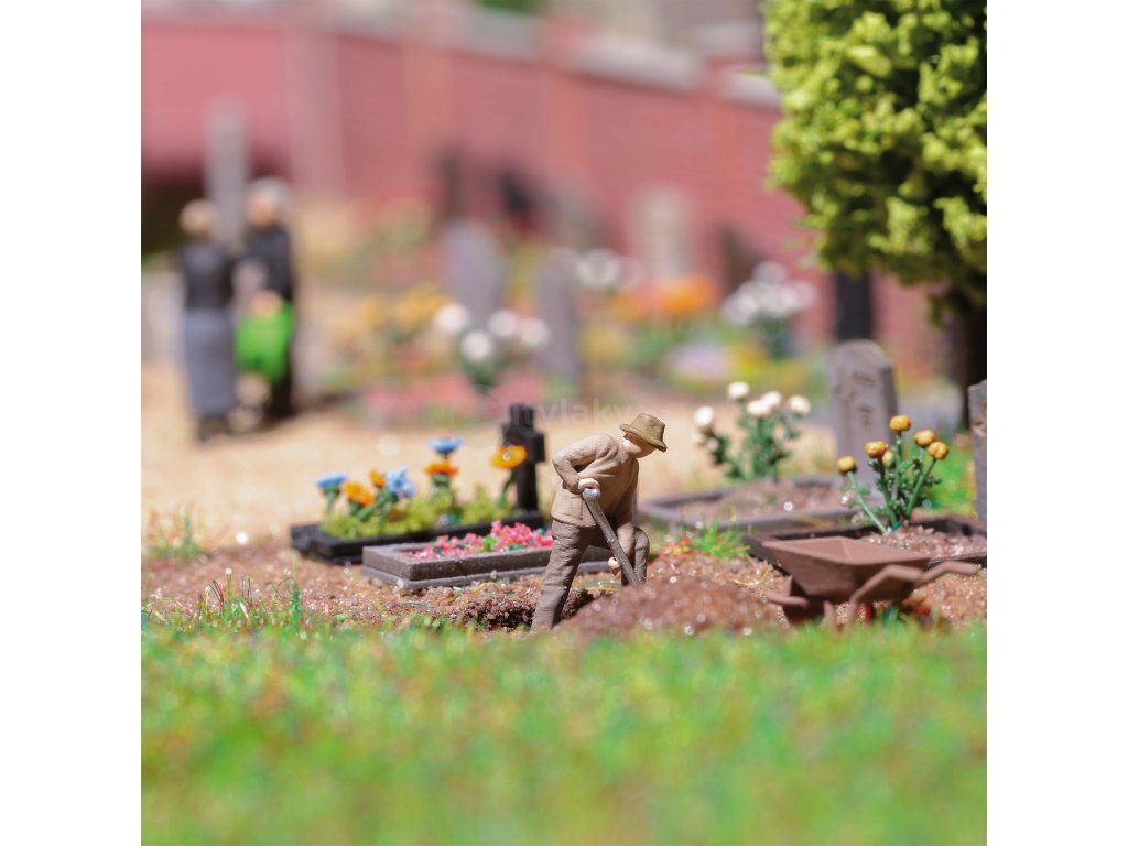 Součástí setu je nabarvená figurka v odpovídající pracovní pozici a tematické příslušenství. Díky tomu scéna působí jako skutečná pracovní činnost, kterou známe z reálného prostředí hřbitovů.