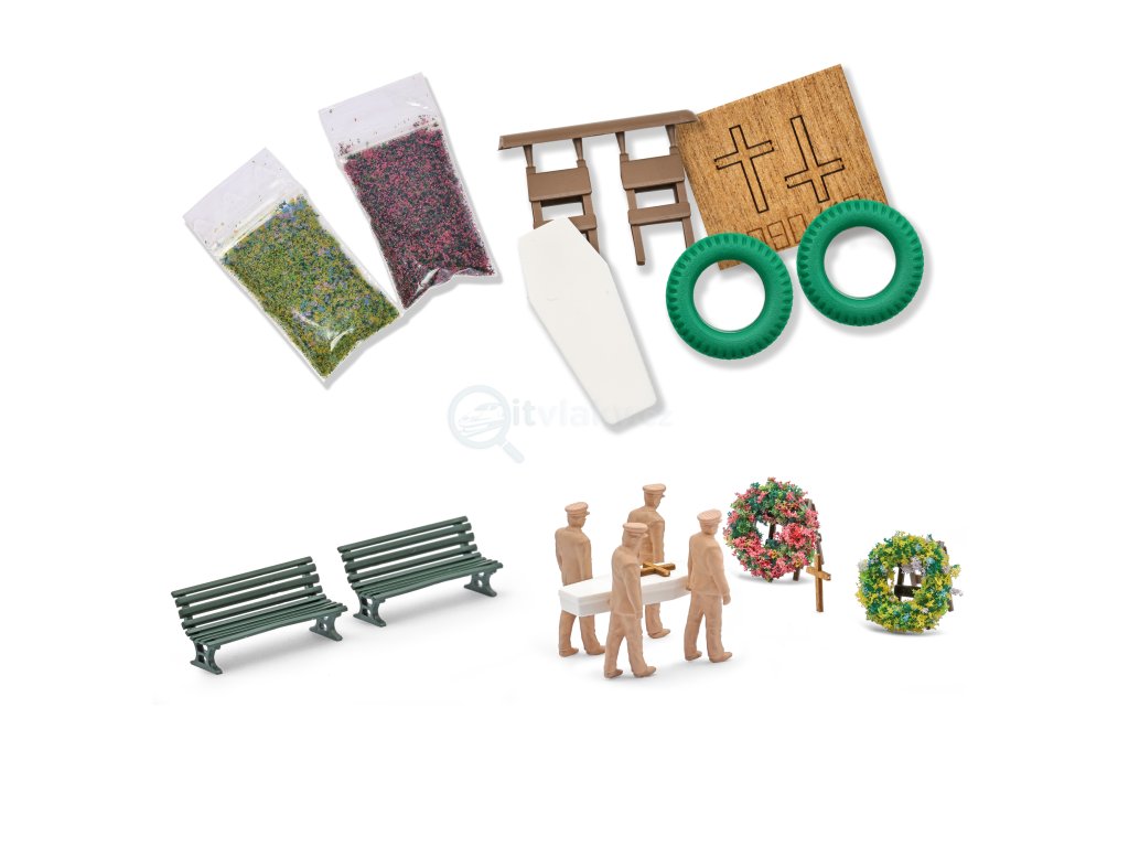 Set obsahuje i další důležité prvky pro vytvoření kompletní a důstojné scény tj. dřevěný kříž, dva květinové věnce (včetně flockovacího materiálu), stojany na věnce a dvě parkové lavičky. Hodí se na hřbitovy, pietní místa nebo klidové části města či parku.