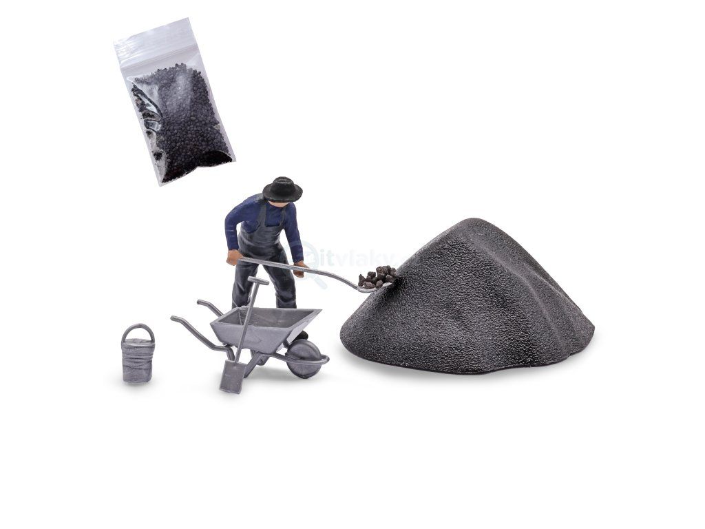 Součástí setu je nabarvená figurka v odpovídající pracovní pozici a tematické příslušenství, díky kterému scéna nepůsobí staticky, ale opravdu žije. Model uhlí je součástí balení, stejně jako kolečko a nářadí.