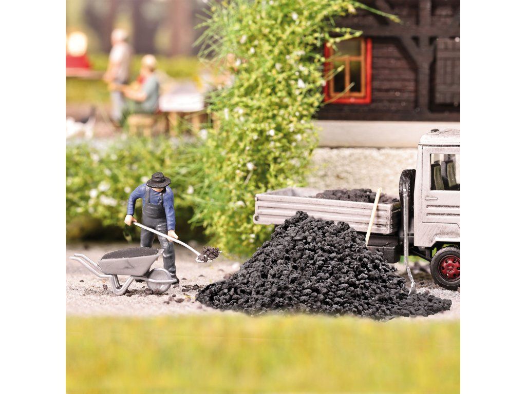 Akční sada pro realistické oživení modelové krajiny, ideální do lesních scén, k milířům, uhlířským chatám nebo historickým provozům. Scéna zachycuje uhlíře při lopatování hromady uhlí, přesně tak, jak to vypadalo v reálu tj. špína, dřina a každodenní práce.