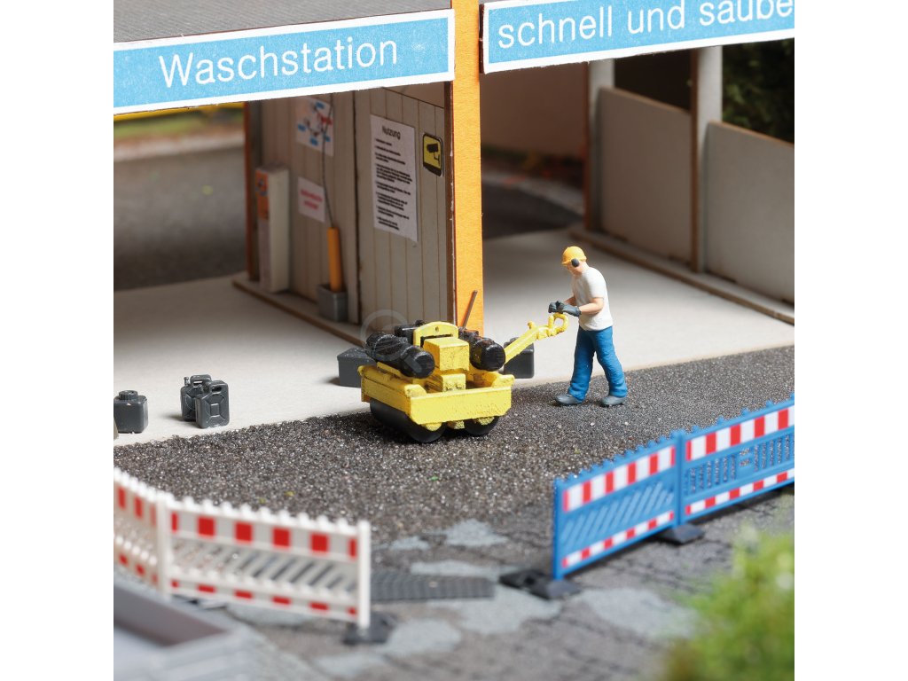 Akční sada pro realistické ztvárnění moderních silničních prací, která skvěle oživí městské i příměstské scény. Stavební dělník vede kompaktní silniční válec a přesně připravuje asfaltový podklad.