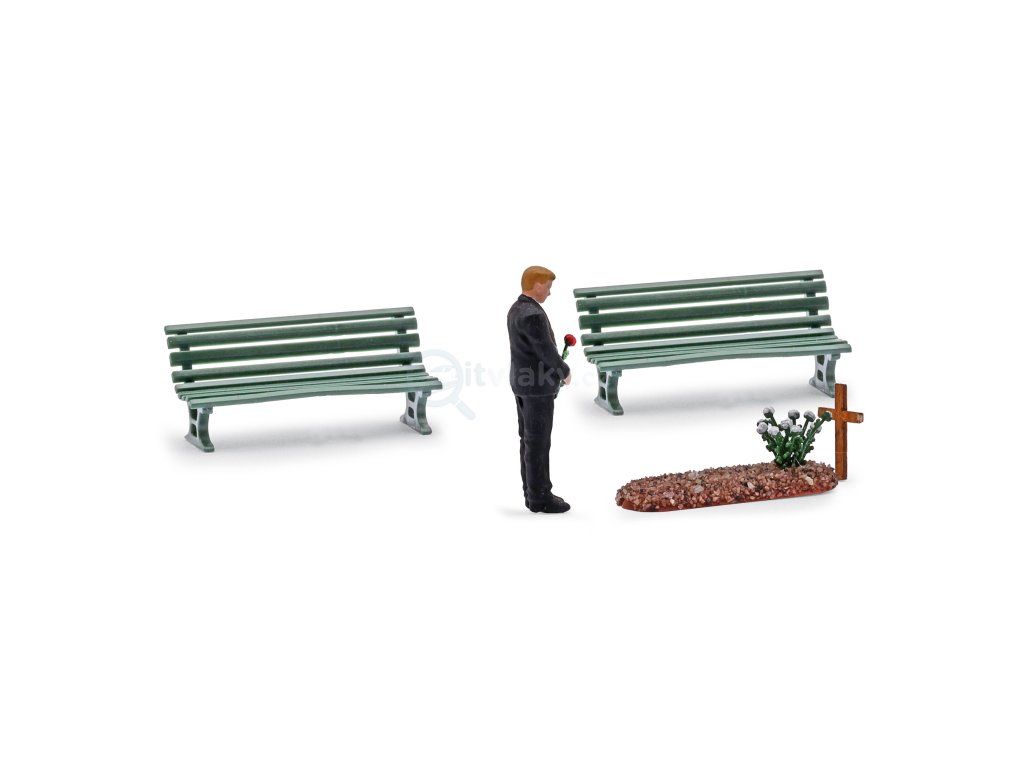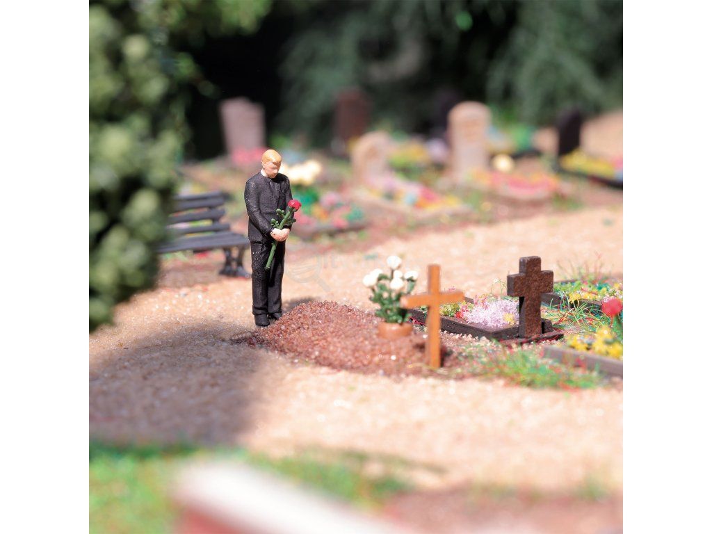 Scéna je doplněna o dřevěný kříž, růžový keř a dvě parkové lavičky. Ideální doplněk pro hřbitovy, pietní kouty nebo klidové části kolejiště, kde má být cítit ticho a respekt.