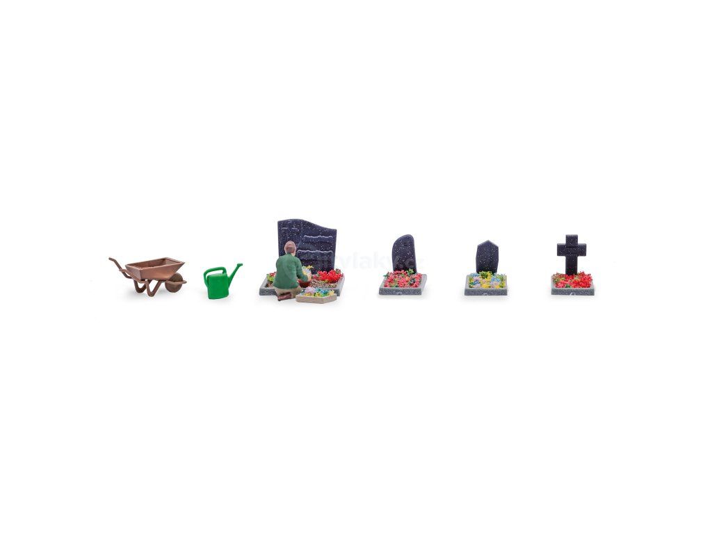 Součástí setu je klečící figurka, doplněná o kompletní pracovní vybavení. Díky různým typům náhrobků a přiloženému flokovacímu materiálu si můžete každý hrob upravit trochu jinak, aby celek nepůsobil jednotvárně a uměle.