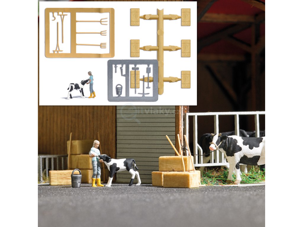 Akční sada pro realistickou animaci vašeho modelového světa. Farmářova žena krmí tele lahví s mlékem. S balíky sena a stájovým nářadím.