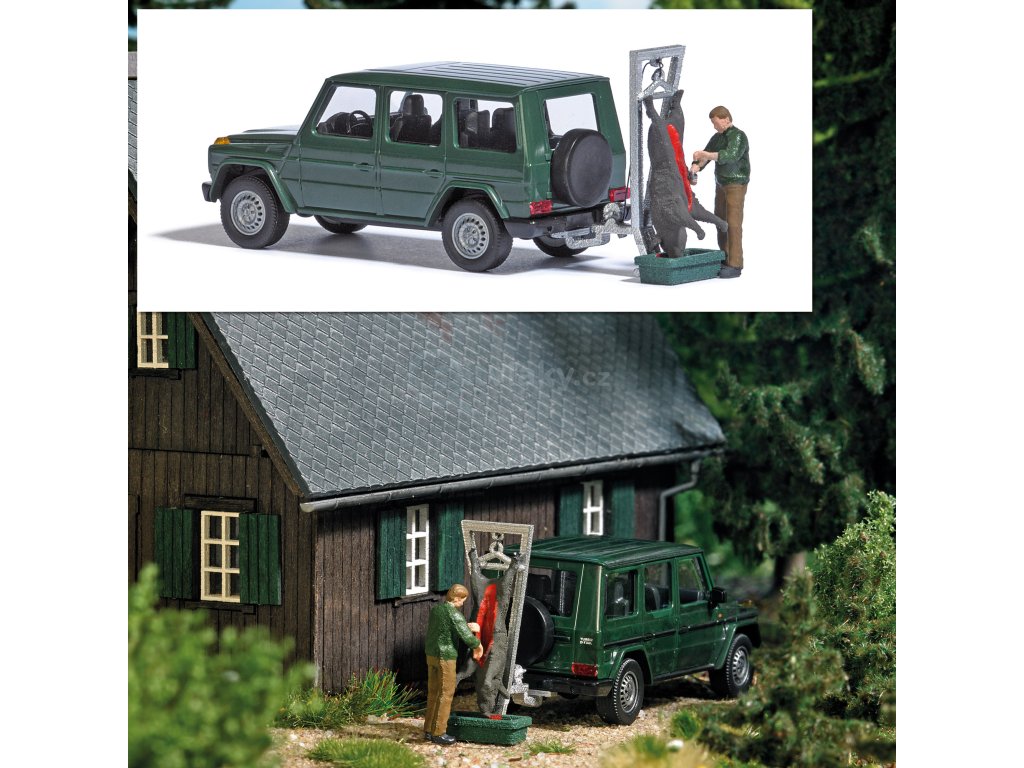 Akční sada pro realistickou animaci vašeho modelového světa. Sada s terénním vozidlem Mercedes-Benz třídy G, k němuž je připevněna řezací pomůcka pro rozbití (rozřezání na použitelné části těla) ulovené zvěře. S lovcem a vanou na zvěř.